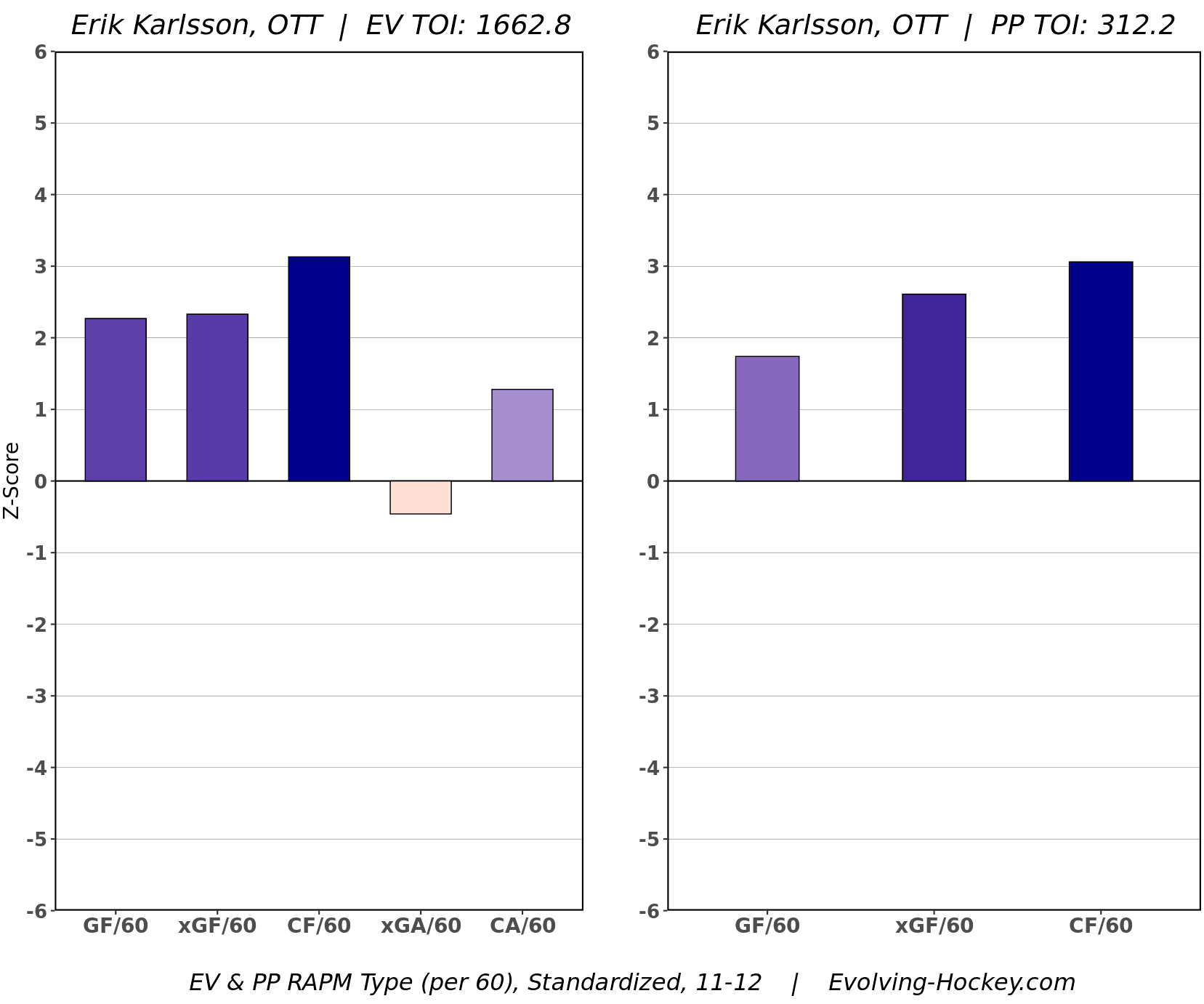 Karlsson’s advanced metrics that season were also crazy, making a huge impact offensively. The only area he struggled in was giving up high danger chances, similar to Hughes. Both Karlsson and Hughes were solid on the power play as well.