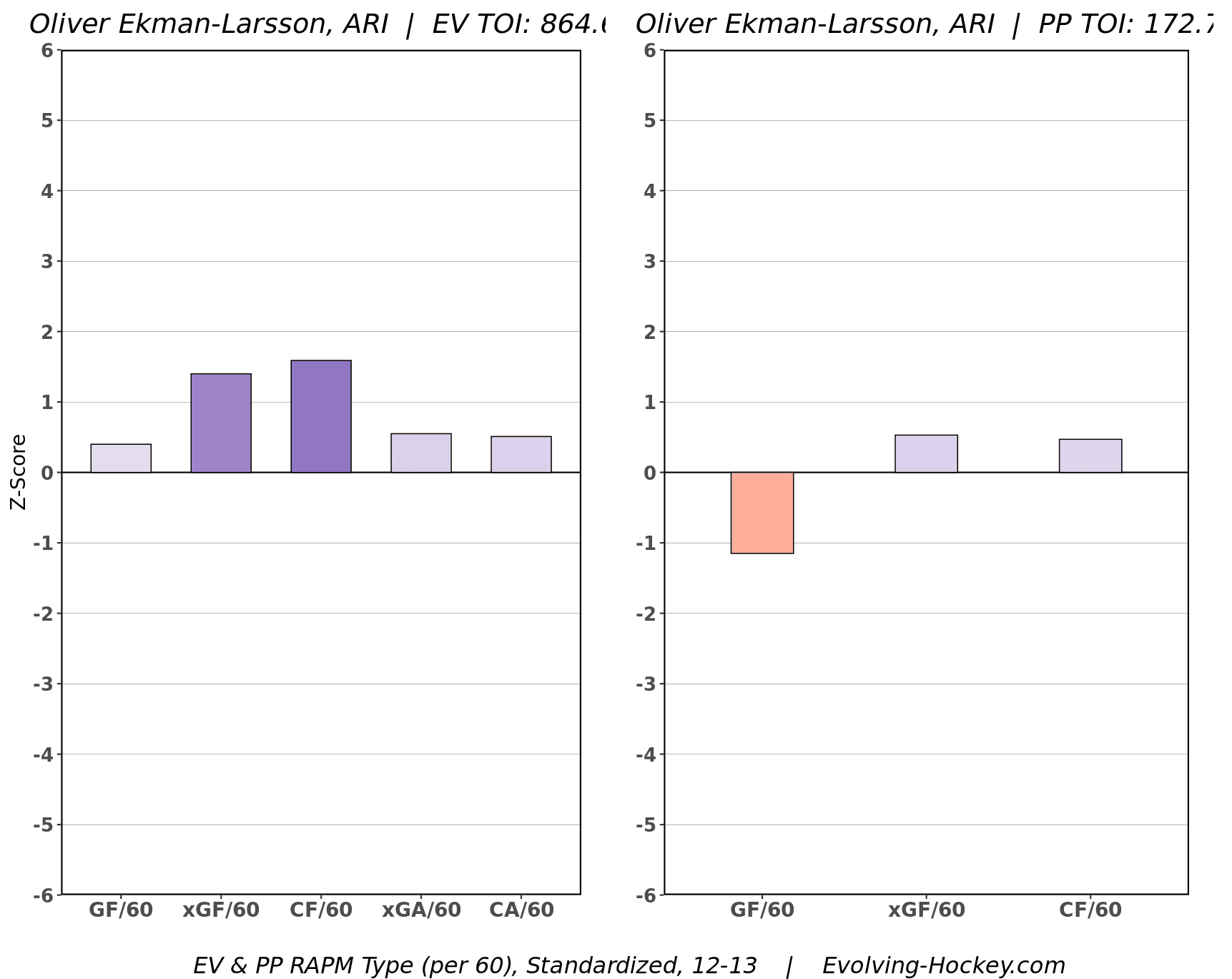 Ekman-Larsson’s time in the NHL that season saw him put up great advanced stats though, producing positively in every aspect of the game. He was also able to create chances on the power play, but not at the level of Hughes.