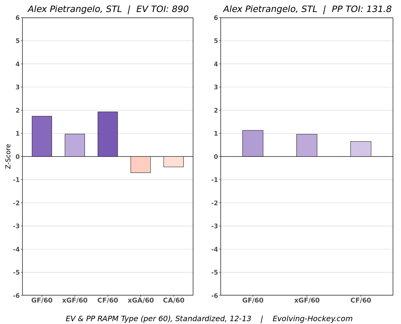 Pietrangelo put up just over .5 points-per-game every season of his ELC, though he did produce a bit less than Hughes was able to last season.