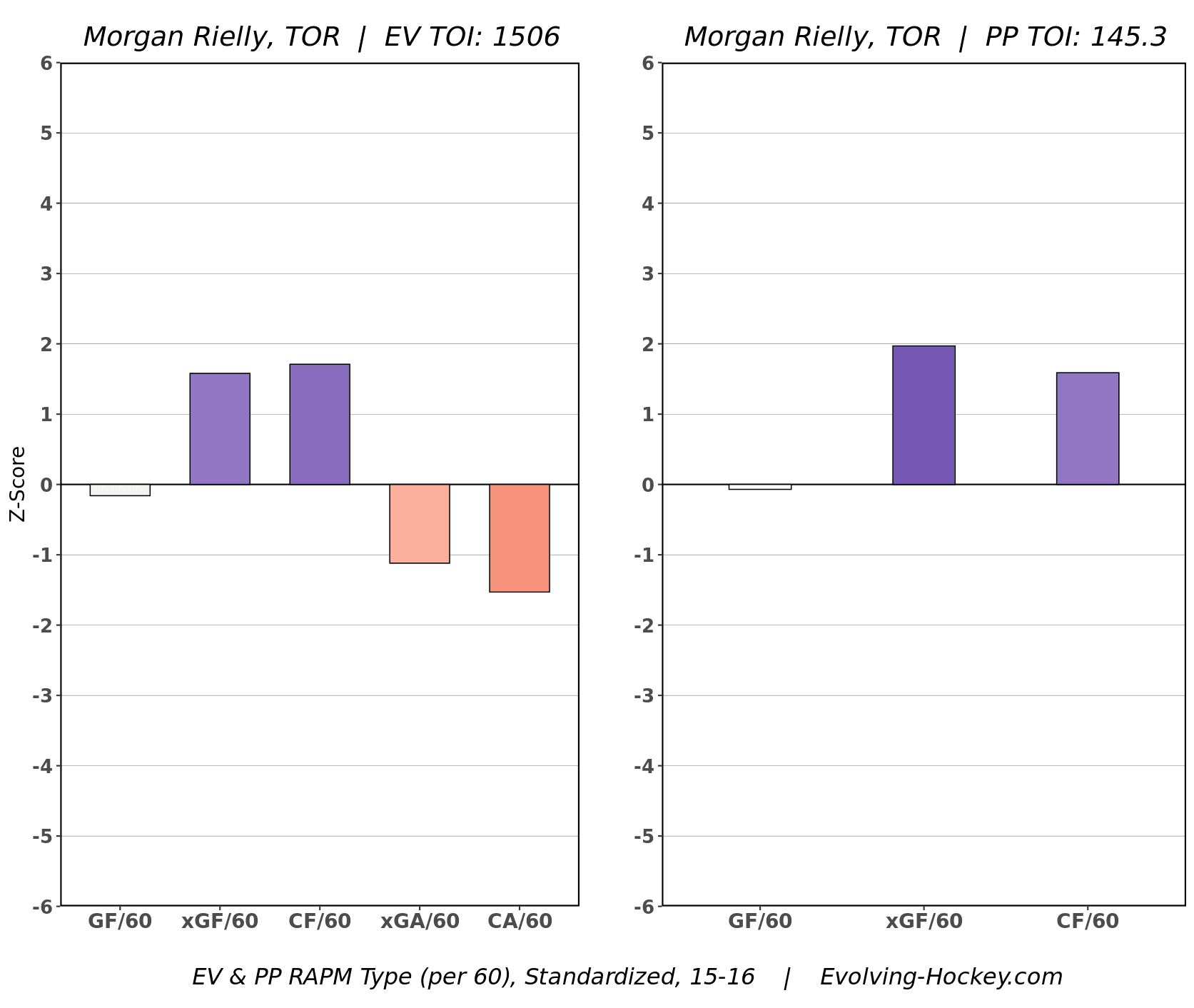 Rielly’s advanced metrics were good offensively, though the Maple Leafs weren’t able to find the net that frequently in 2015-16, which is more of a reflection on the talent on that team at the time. Rielly also didn’t play on the power play as much as Hughes did in his rookie season.