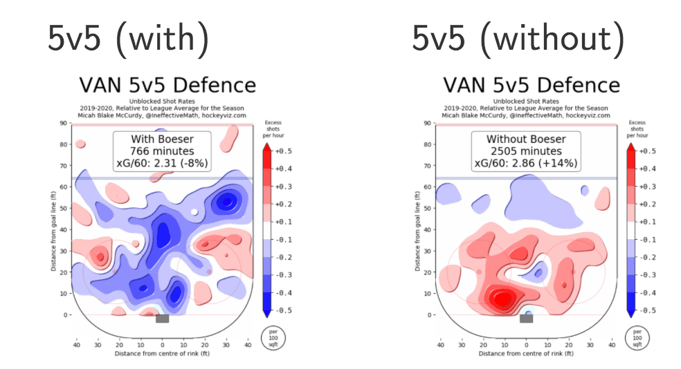 He became a more well-rounded player in 2018-19, as Vancouver gave up less expected goals every hour with Boeser playing than without him. Even so, the team still conceded more scoring chances with him on the ice than the league average, although the margin was slim.