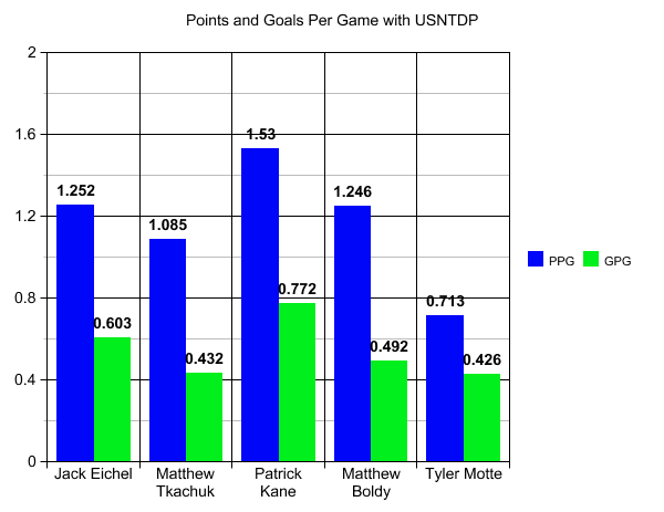 Boldy scored a total of 62 goals in his USDP career, that puts him 8th in team history, just a few back of Jack Eichel. His career points and goals per game rank up there with some current NHL stars and towers over former USNTDP star Tyler Motte.