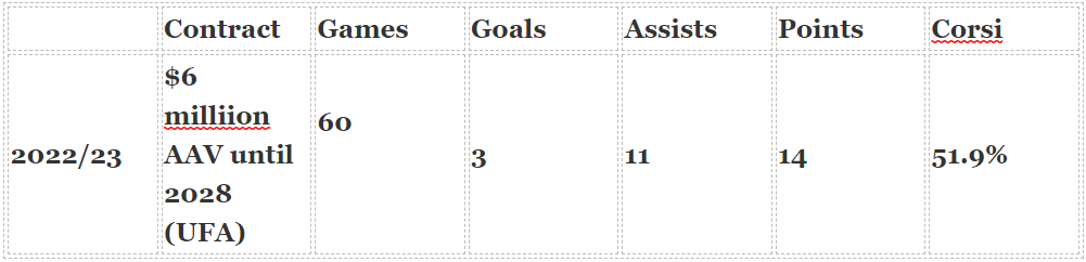 2022/23 | $4.1 million AAV until 2027 (UFA) | 75 | 3 | 13 | 16 | 50.2% |