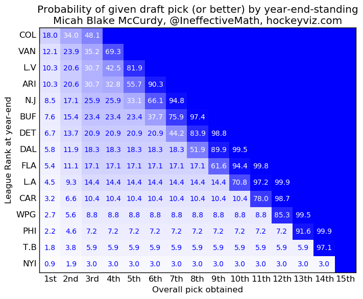 Frankly, the odds favour the Canucks moving down. Lotteries are a game of chance, and there is only one winner of the ultimate prize. Although the team has a 64.8% chance of sliding to four or five, they also have 35.2% odds of picking somewhere in the top three.
