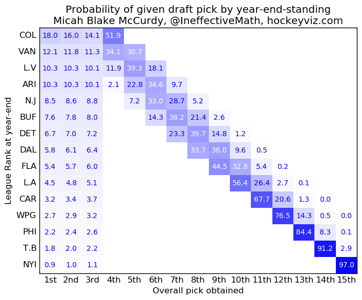 As you can see, the Canucks are most likely to end up with the fourth or fifth overall pick. Heartbreaking. Last year, Edmonton was in the same position as the Canucks are in now, and they dropped two spots. The lottery was advantageous for Winnipeg, who jumped up four spots with a 7.8% chance of receiving the second overall pick. And lastly, Toronto demonstrated that teams could also stay where they are. They remained in the first-overall position with 20% odds.
