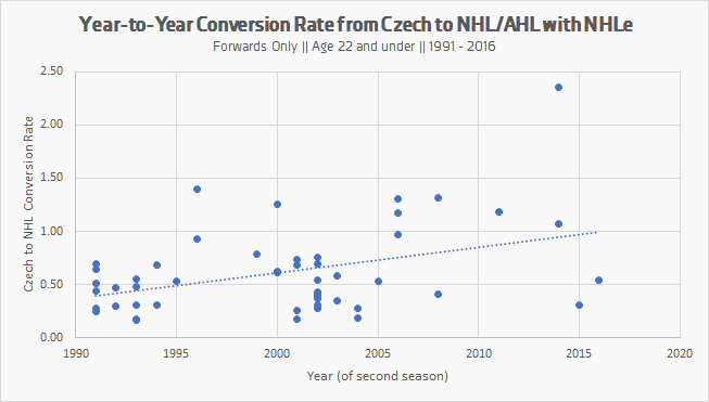 SEAL’s league adjustments are objective and shouldn’t be manually adjusted on a whim, but it did get me thinking about an alternative explanation, such as that the quality of the Czech league is improving, making it harder for young players to produce points compared to their predecessors. Plotting the year-to-year conversion rates over time, that does appear to be what’s happening: Czech players are retaining their per game production better than they used to, meaning that either the Czech league is improving, or the NHL and AHL are getting worse (the former explanation seems much more plausible).