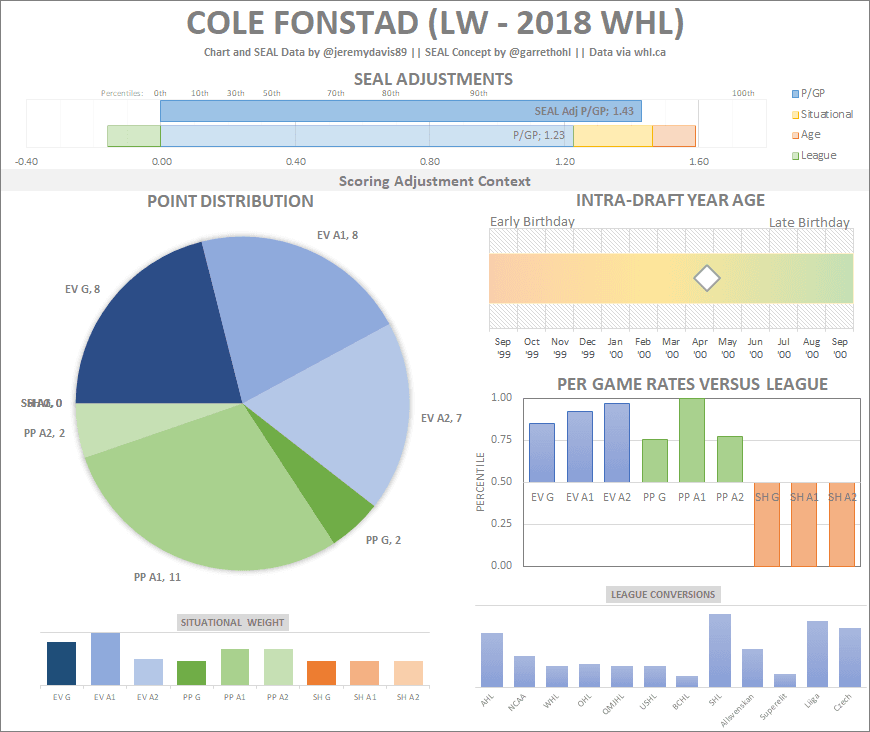 Fonstad is currently seventh in SEAL adjusted scoring, with an adjusted rate of 1.46 points per game (SEAL is designed so that 1.00 adjusted point per game represents 1.00 point per game in the OHL by a player who turns 18 on September 16th prior to his draft season, i.e. the oldest possible age of first time eligibility).
