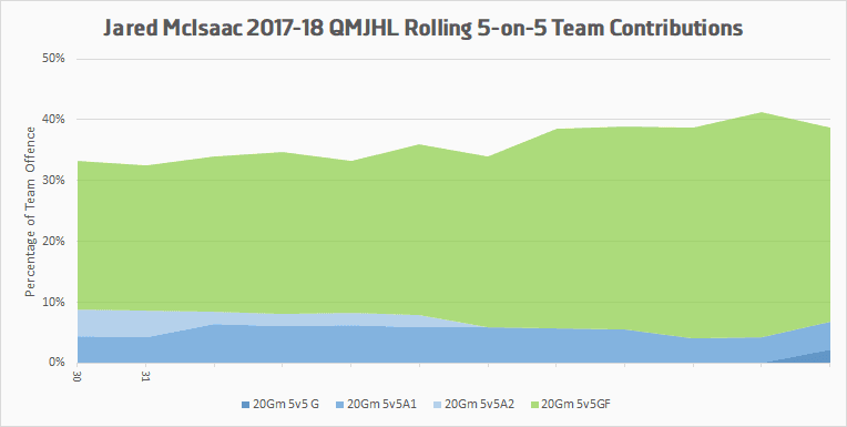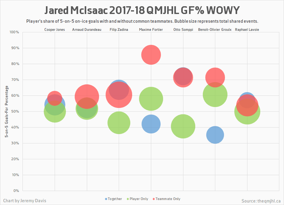 In terms of goal differential, McIsaac is in the black (52%), which is of course a good thing. However, the Mooseheads are a dominant team at evens, with a 57% goals-for ratio as a team, and a 61% goals-for ratio when McIsaac is on the bench, giving him a minus-9.3% relative GF%. This red flag is further demonstrated by his GF% WOWY chart: