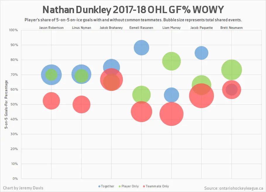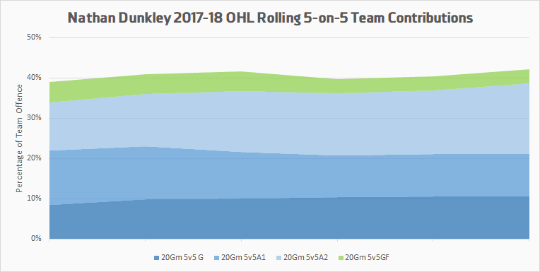 Not only are the Frontenacs scoring a lot of goals (and not allowing many) when Dunkley is on the ice, he’s factoring in on a huge percentage of them. He has a point on 32% of the the 5-on-5 goals scored by Kingston thus far, and a primary point on 19% of them, as well as collecting a point on 89% of the goals that he’s been on the ice for. Held over a full season, those would be elite numbers.