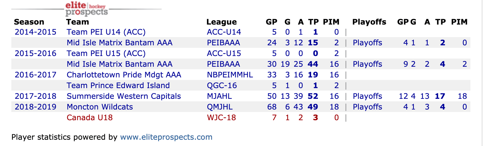 “Lanky winger prefers to distribute the puck rather than shoot it. He owns strong vision, creativity and offensive instincts. His skating stride is a work in progress but should be bolstered as he develops strength in his lower half.” – Cam Robinson, Dobber Prospects