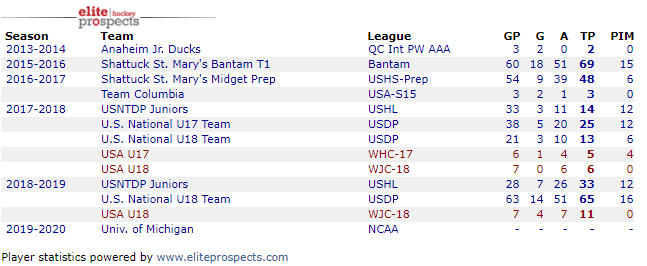 Profile: Committed to University of Michigan next year, defenceman Cam York uses his skating and mobility to move the puck up the ice with ease. His shot from the point is one of the best in the draft class, using both a slapshot and wristshot. The top defenceman on the USNDP team featuring Jack Hughes, Trevor Zegras, Alex Turcotte, and Cole Caufield.