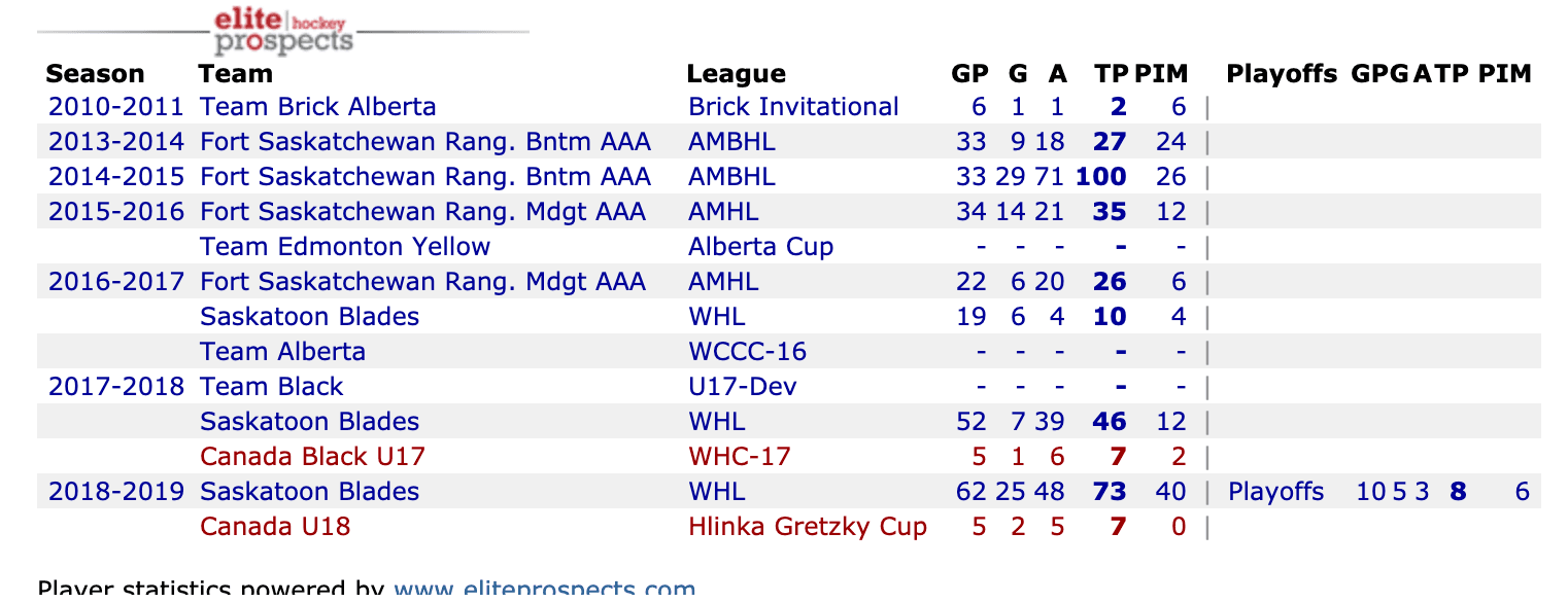 A pass-first centre who owns great awareness and deft puck skills. Uses his body well to protect the puck and exploit seams. He lacks explosiveness with his skating and can stand to play with more pace at times. But this is a player with a huge upside. Can pile up points in bunches. Smart. – Cam Robinson, Dobber ProspectsDach is both highly intelligent and smooth, which allows him to be one of the more gifted playmakers in the draft despite a lack of explosive skating. – Chris Peters, ESPNGot an early taste in the “Dub” when injuries befell the forwards on Saskatoon, and showed off his competitive nature and was able to set up and score goals as a 16 year old, and displays smarts, size, good feet and a 200 foot commitment. Not a speedster, but has a great stick and soft hands as a high-end playmaker. Can control the pace and the play. Another wing-centre who is very strong on his skates and can move with above average speed while he maintains possession using his soft hands to find open line mates when he has the puck, and quickly ghost into quiet soft areas to receive returns and scoring looks. When watching a guy this big, you think he is going to get held up but he seems to keep driving effortless keeping the defenders away from the puck with his long reach and staying in motion while he supports the play. He avoids attackers with side-stepping and a quick stick. He follows the action but the action tends to follow him too. Strong in so many phases of the game already, he is always close to attackers in his end nudging close deterring their advance. Is a regular of the PK and PP. I think there is upside as a pro scorer, but many of his goals will continue to come with plays he started where he positioned himself between the circles, stick on the ice, and wasn’t stopped. He is able to read coverages, make sharp cuts, by driving into the turns. His edge work keeps him away from closing traffic, and frequently leaving him uncovered in the dirty areas. Plenty of room to imagine him as blossoming as a scorer as well as set-up guy. May project as an NHL centre. Big guy with big strong wrists, who gets in close and difficult to move out from the front or take the puck away from. It might take time but no NHL team is going to pass on big man with these tools. – Bill Placzek, Draft Site