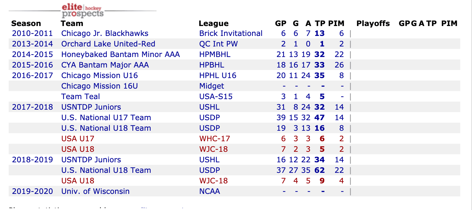 Alfie’s son is a 200 foot centre with decent size and elite feet and hands. His wide skating base and strong edging work allows him rapid change in direction. Unfazed by venturing into the dirty battle areas. He can finish and his puck-handling, high hockey instincts, and soft hands rate up near the top of the class. An injury-riddled year has set him back a bit, but I wouldn’t count him out of being taken in the early part of the first round. Has great speed, an extra gear and displays strong edging. Has really good patience in his possessions, and will rile defenses into over commitment, and then place the biscuit on a teammates stick for a shot. He plays fast because he is able to slow the action down in his head and use his hands and stick abilities to surprise offensively, and in the two other zones to beat opposition to the puck with his intense compete level. He will fearlessly take a hit, kills penalties, block shots and more importantly is an improving in the dot. Has built a two-way game. His high end skill, balance, explosive feet and terrific touch and handles in tight spaces, is enough to make NHL suitors think the end product is going to something special. Has seen action as a winger. Committed to the University of Wisconsin. – Bill Placzek, Draft SiteThe Wisconsin commit blends exceptional defensive play with high-end speed and skill. Has played second fiddle to Jack Hughes for years, but is beginning to step out of his shadow. A coaches dream. – Cam Robinson, Dobber ProspectsAlex’s personality is a blend between Sidney Crosby and Brad Marchand because he’s so agitating like Marchand but will never give you the time of day like Crosby. Just the way he carries himself on the ice is very annoying to the other team because he’s so good and so versatile. He can go right through you or dangle you. – USDP coach John Wroblewski