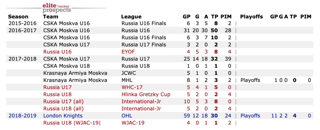 Guskov‘s skating is the jewel of his game, as he has a fluidly rangy stride and crossover, and can gain speed carrying the puck, looking like a pro when he does so. Guskov also seemed to do a good job using his big body along the boards to keep pucks in the zone. Overall, he has tools that show some high-end potential. – Zach Thomson, Future ConsiderationsHighly skilled centre who already is playing his first North American season with The Knights this season. Displays a high skill level in all areas, and is ultra-effective playing at a high speed pace. Dynamic as a scorer and playmaker, he plays a 200 foot game and exhibits a level of hockey IQ and maturity. London strong line-up has him relegated to left wing and fourth line duties in his initial North American season, but will eventually settle in to his centre position. He has an excellent shot but he at this juncture looks like a perimeter player, afraid to play the game in the high traffic greasy areas. Has a physical tools and a frame that will allow him to add muscle and girth. – Bill Placzek, Draft Site