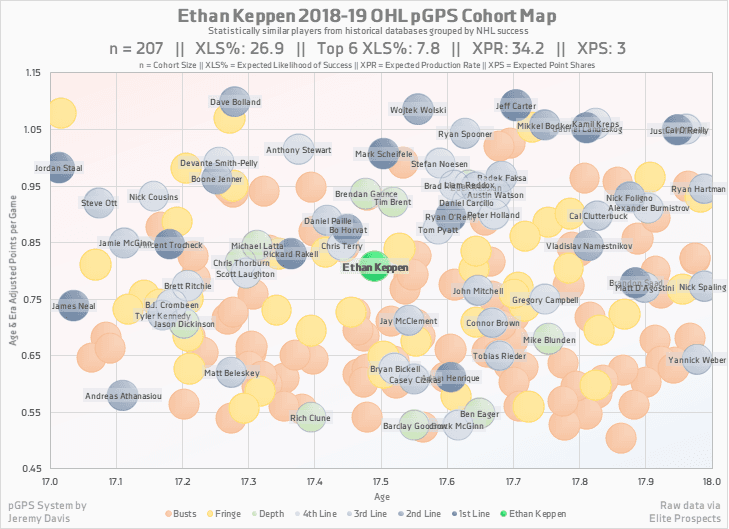 For a more precise look on where he projects to be, we turn to Jeremy Davis’ pGPS Cohort Map to really get a sense of other players that went the OHL route and had similar effect on their team as Keppen did this past season.