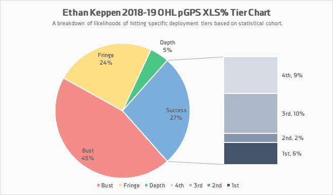 But as seen at that top row above the map, Keppen has an expected likelihood of success (XLS%) of 26.9. While that seems low, it’s fairly average for a prospect of his calibre — not at the top level but should get into the professional ranks at least.