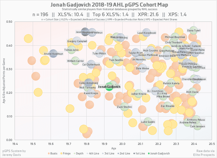 Gadjovich’s development curve—as represented by Davis’ Year-to-Year pGPS Chart—looks almost exactly like one would expect, cresting in 2018 and crashing the next year. His chances of playing a scoring role for the Canucks have thus suffered greatly, but Gadjovich’s narrative has always been that of an individual more suited for a bottom-six job in the NHL—and he’s still tracking well enough for that.