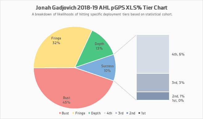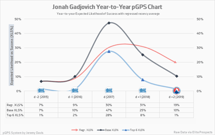 Whether one sees Gadjovich’s rating under the pGPS system as a positive or a negative is a matter of perspective. On the one hand, any dreams of Gadjovich turning into a Todd Bertuzzi-lite are probably toast after Draft+1 and Draft+2 seasons without significant growth—but that was always a longshot outcome for a late second rounder.