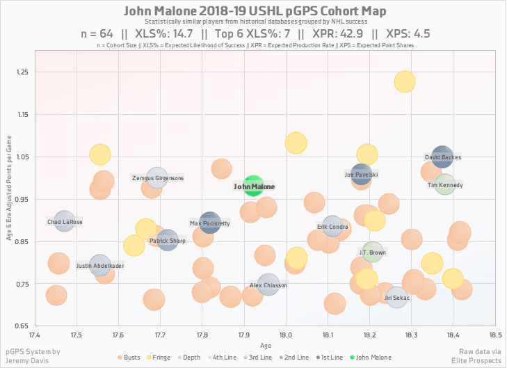 When viewed through the lens of the prospect Graduation Probabilites System, Malone comes out looking pretty good for a sixth-round pick. pGPS give him an expected likelihood of success of 14.7%, and a top 6 XLS% of 7%. He’s got some impressive players in his cohort, too, with Max Pacioretty, David Backes, and Joe Pavelski among the most well-known names.