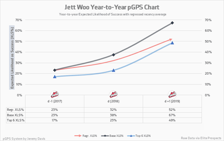 Woo’s Year-to-Year pGPS Chart clearly shows that Woo has steadily increased his chances of success at the NHL level through each of his seasons with the Warriors. Upon being drafted, Woo clocked in at 32% odds of success and 23% odds of playing an important role on an NHL blue line—but after 2018/19 those numbers have shot up to 52% and 49% respectively.