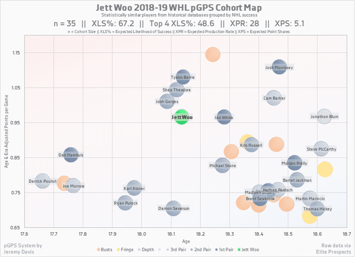 Woo’s increased production puts him in some pretty rarefied company according to Davis’ pGPS Cohort Map, with most of Woo’s comparables having gone on to play top-four roles at the NHL level. It’s important to note, however, that Woo plays a fairly unique game and is thus hard to place in any sort of comparative model—and few of his comparables can boast the same sort of physical game that Woo brings to the table.
