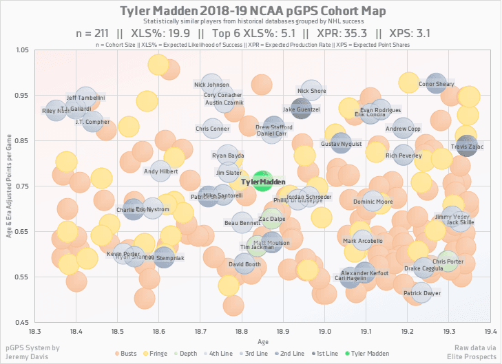 If Madden does indeed beat the odds and develop into an NHL player, it will most likely be as a bottom-of-the-lineup player, although a healthy number of players in Madden’s cohort did go on to become top-9 players.