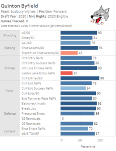 Diving deeper into Byfield’s numbers, he posted a 1.51 primary points-per-game which was third out of all prospects in their first draft-eligible season this year. He also had a hand in 45% of Sudbury’s total goals on the season which is only second to Alexis Lafreniere. Micro stats tracked by Mitch Brown give us a better understanding of the ways that Byfield impacts the ice for his team. As we can see from the chart below, Byfield was in the 93rd percentile of the 857 prospects tracked by Brown this season. His passing game was also extremely strong as he was in the 96th percentile in shot contributions although he struggled to create shot assists off the rush. Byfield was also a strong influence pushing play up ice as he posted strong controlled entry and exit numbers.