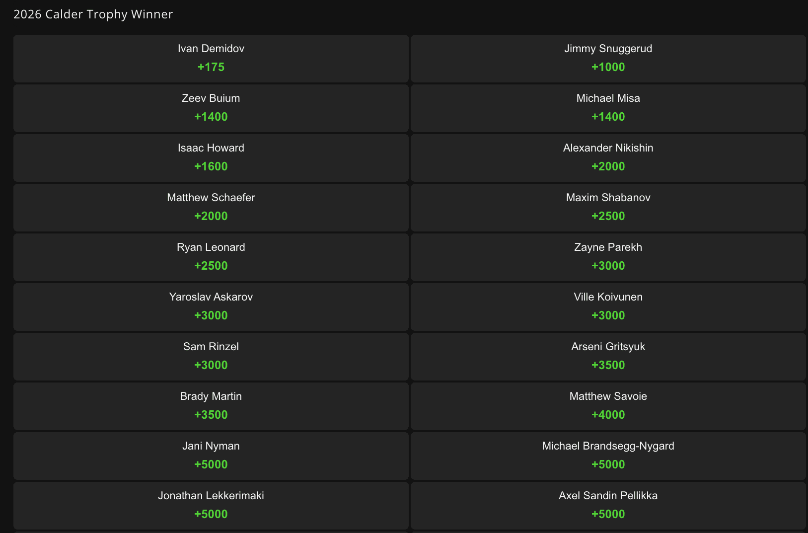 Looking at the odds boards, the betting markets have Montreal Canadiens rookie Ivan Demidov as the runaway favourite to win the award. In fact, no other rookie has lower than +1000 odds.