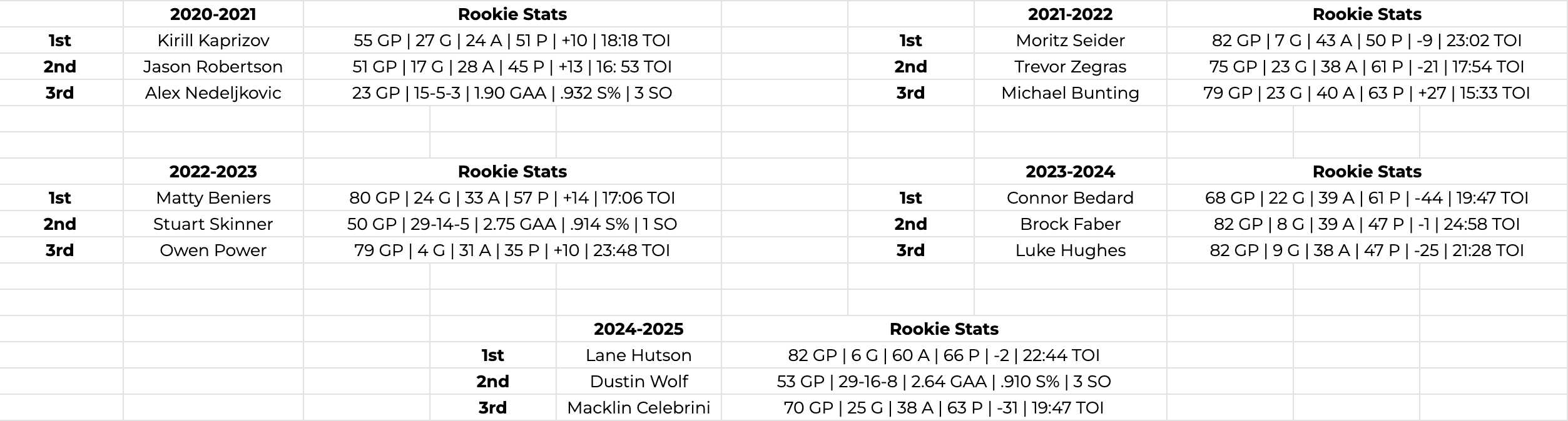 That being said, NHL experience isn’t a necessity to being nominated for the Calder. Four of the last five years have seen a rookie with zero games under their belt (Kaprizov, Seider, Bedard, Celebrini) get nominated. However, three of the last five years have seen a player with double-digit NHL games (Zegras/Bunting, Beniers/Skinner, Wolf) also appear on the Calder ballot.