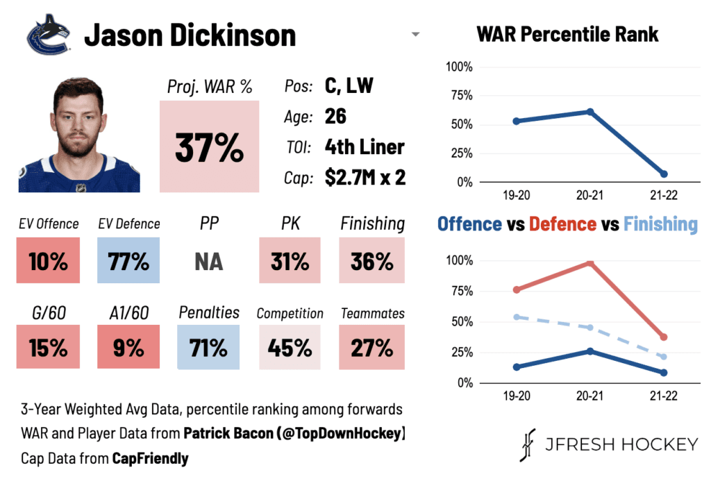 While Dickinson’s the superior defensive player, his non-existent offensive game still makes him a liability on the ice. For reference, the Canucks stifled their opposition last year by giving up just 1.8 goals against per hour at five on five with him playing, but the team also generated an anemic 1.55 goals per hour in those same situations, so their goals for percentage was still below-average at 46.15%.