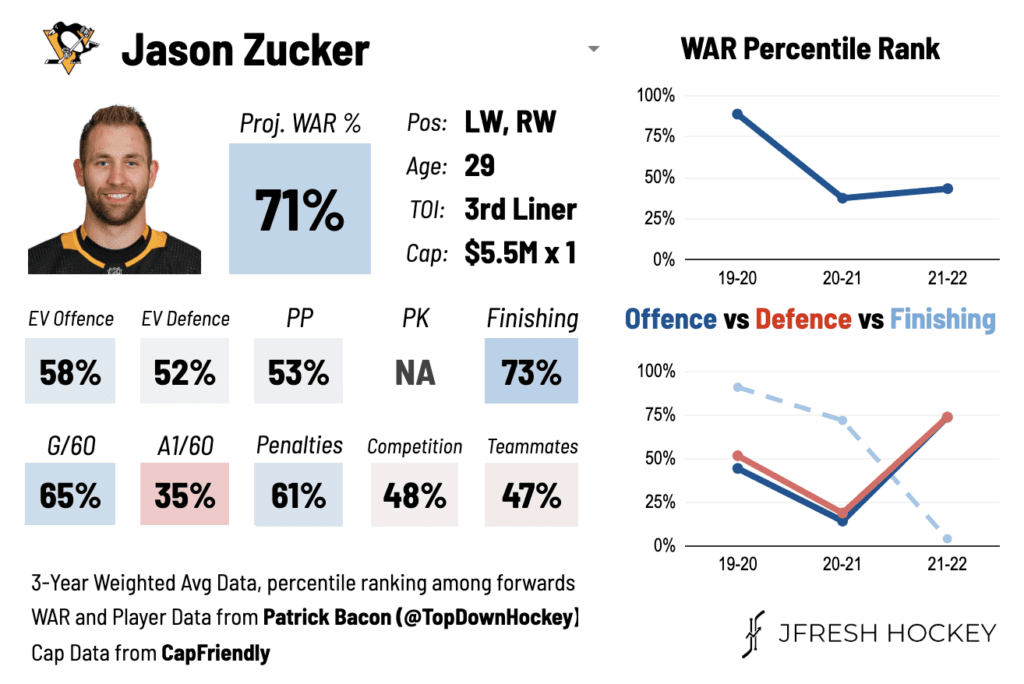 It’s a Jason for Jason trade! Pittsburgh will definitely be looking to shed some money this offseason with Evgeni Malkin and Kris Letang set to become UFAs, and Zucker seems like the most obvious player to be moved. He’s owed $5.5 million next year and is still a useful middle-six forward when healthy, but that price tag is definitely hard to swallow for a Penguins team in need of cap space.