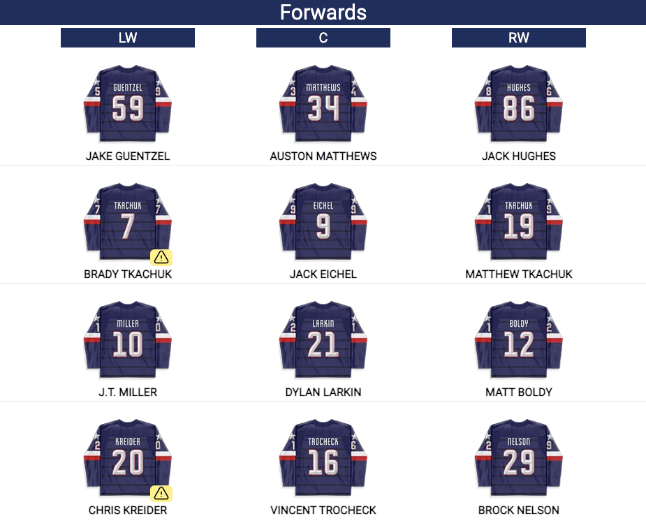 After missing practice after leaving the game against Team Sweden, Brady Tkachuk re-enters the lineup. Chris Kreider looks to hold his spot with Kyle Connor sitting.