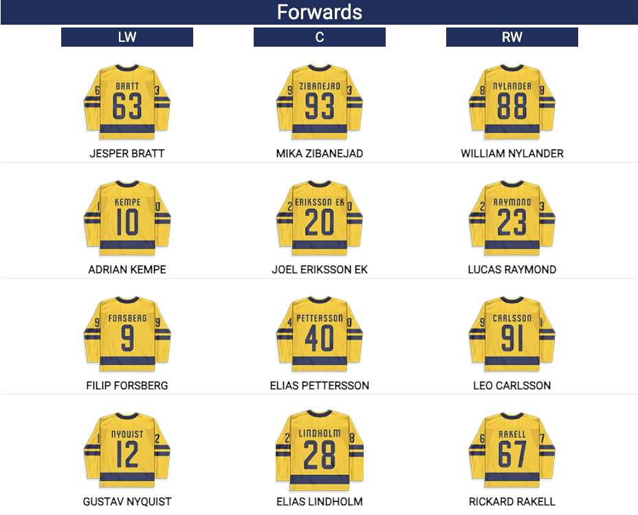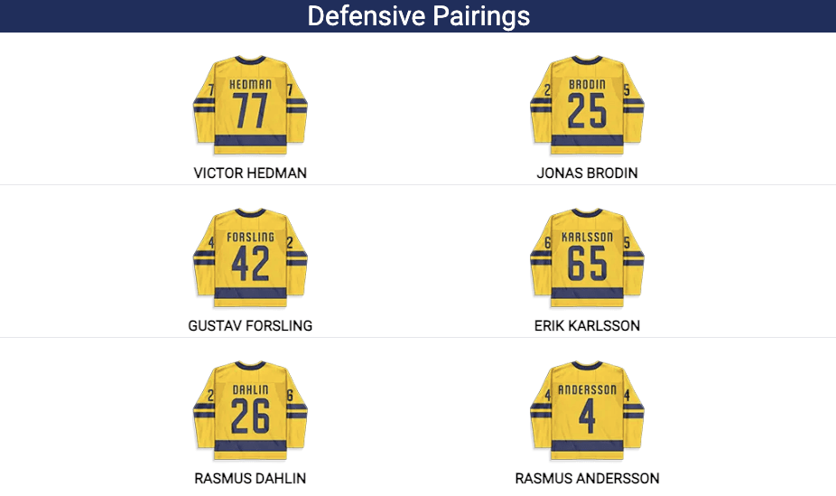 Team Sweden has switched up their lines. They’ve loaded the top line now with Jesper Bratt and William Nylander on Mika Zibanejad’s wing. Nylander has been buzzing so far in this tournament but has yet to find the back of the net. Look for him to make an impact and try to will the offence in this matchup.