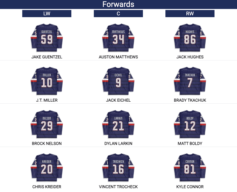 Matthew Tkachuk and Charlie McAvoy will be held out of the lineup for injuries. Chris Kreider and Jake Sanderson will make their Team USA debut.