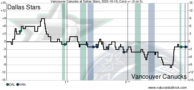 The Canucks have yet to play a single game where they’ve controlled play throughout, but their win against Dallas is the closest they’ve come to a complete game effort. After jumping out to a 2-0 lead and dominating the first 20 minutes, the Stars couldn’t muster nearly as many scoring chances once the Canucks jumped into the driver’s seat.