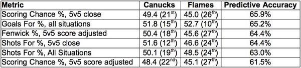 4) Advanced stats tell a story. The Canucks may not be so awesome at most of the new fancy stats but they rule in lots of non-fancy stats, like, say, wins. For example, in comparison with the Flames, the Canucks have more of them.