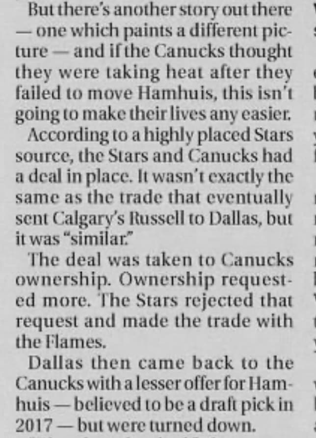 Benning said on free agency day the summer that followed: “We tried our best and it didn’t work out. It would have been nice to get a draft pick, but at the end of the day the offers weren’t there to complete any sort of deal.”Whether Benning and Co. already knew that they weren’t bringing Hamhuis back at the trade deadline and failed to get anything at all for him in trade remains one of those great Canuck questions.