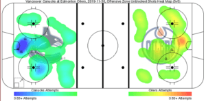 The month of November has been harrowing for the Canucks. After starting the season 8-3-1 in October the Canucks went 5-7-3 in November. However, they closed out their six game road trip in Edmonton on a high note with a 5-2 win against the Pacific Division leading Oilers. The Canucks set the tone for the game right from the first period, outshooting the Oilers 17-7 and 38-29 total. They were struggling to get shots on goal during this road trip averaging 25.6 SOG compared to their season average of 32. Bo Horvat and Elias Pettersson did a great job against the Oilers’ top line, holding Connor McDavid to two points and kept Leon Draisaitl off the score sheet entirely, even Loui Eriksson with his first goal of the year had more points than Draisaitl tonight. Tanner Pearson led the Canucks with a 4 point night and Horvat was right behind him with 3 points.