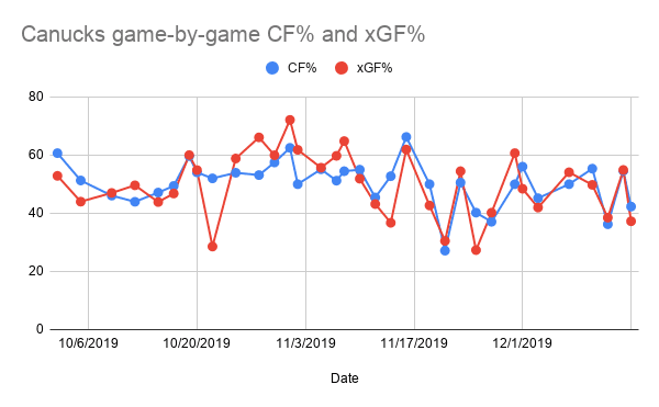 From the start of the season up until November 10th, the Canucks were rocking an impressive 53.6 CF% and a 54.5 xGF%. Since then, they’ve averaged a much less impressive 48.48% and 44.62%, respectively. It’s a massive drop in overall team performance, and one that’s worth exploring more deeply.