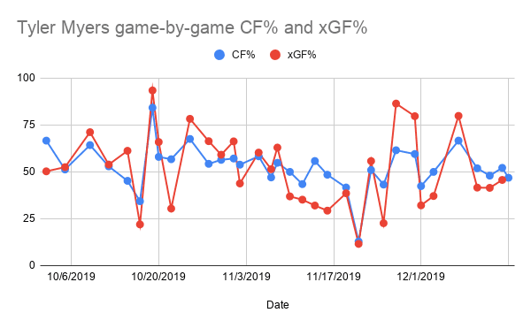 Myers’ decline from where he was at just a little over a month ago serves as a proof-of-concept for that third possibility. Before November 10th, Myers was an elite defender by expected goals, boasting an xGF of 58.2%, and looked comfortable in his role as the team’s top right-handed defender. Since then, his performance has cratered, he’s averaged an xGF of just 44.6%, and has been outplayed by each of the Canucks other two right-handed defenders from an underlying perspective. At this point, it’s probably worth questioning whether or not it was a smart idea to assume Myers’ first 15 games as a Canuck were more indicative of who he is as a player than the previous 600 or so that he logged with the Buffalo Sabres and the Winnipeg Jets.