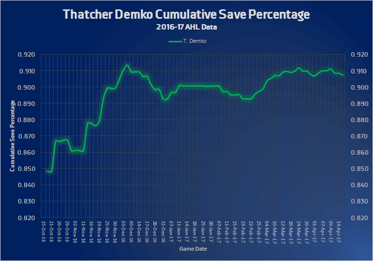 Signed as a free agent out of the QMJHL following a 47-goal campaign in 2015-16, Carcone had a nice rookie season in the AHL, also under Travis Green of course. The best part about Carcone’s season last year is that he just kept getting better along the way. We love progression, and so do coaches.