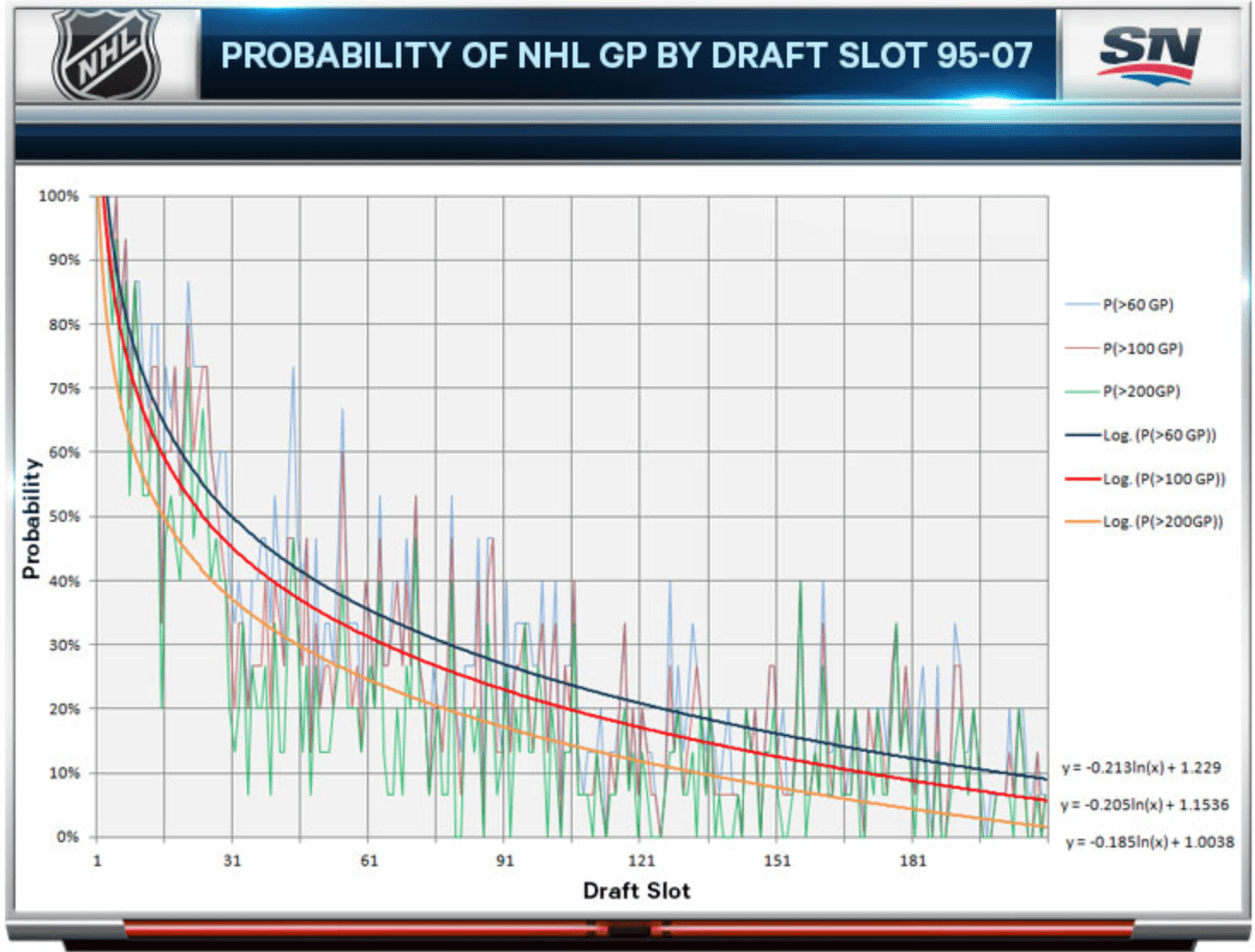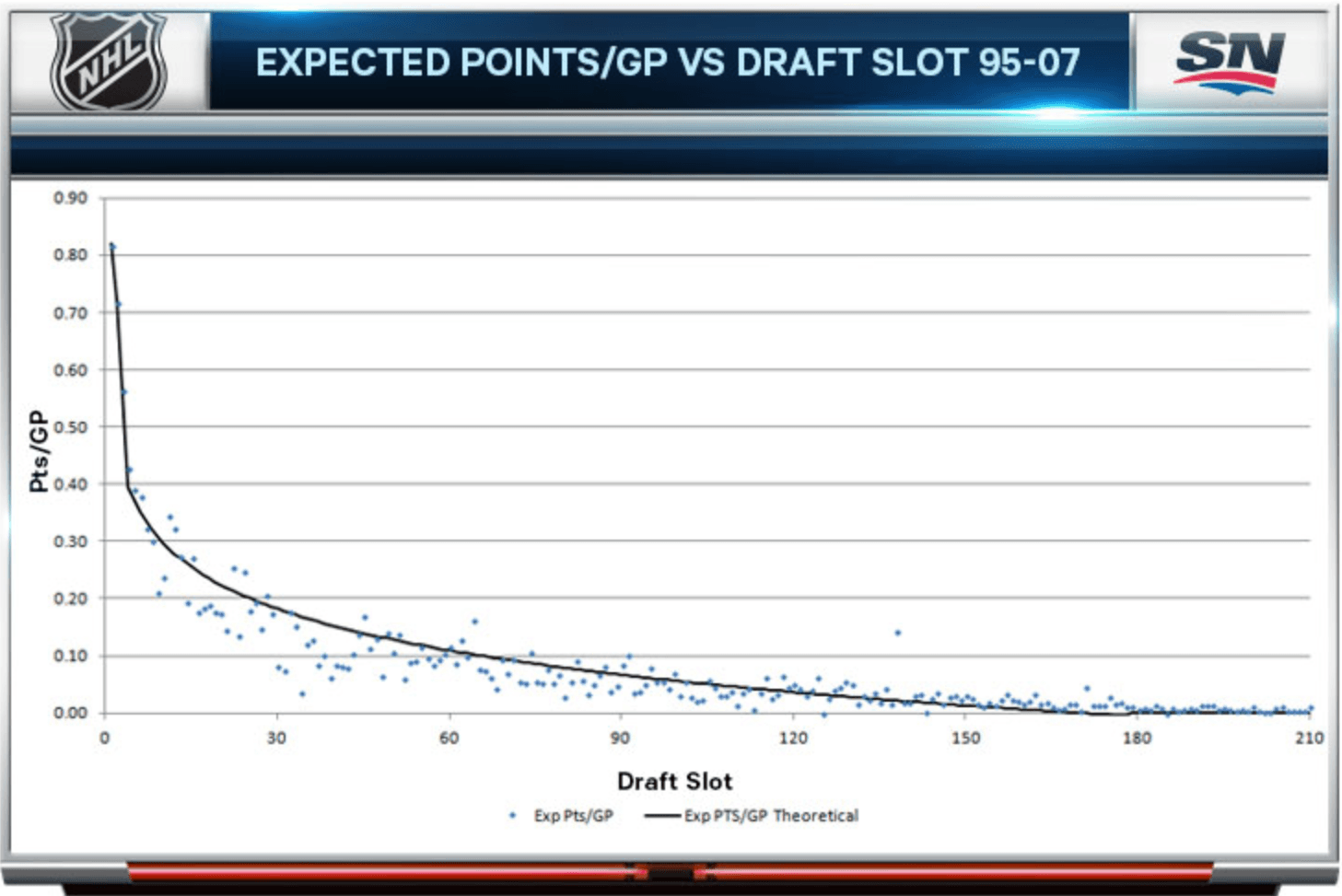 Sportsnet has you covered. Stephen Burtch conducted a study back in 2015 that looked at probability of GP and expected P/GP based on draft slot. As you might expect, value at the top of the draft was high, and dropped off significantly towards the end of the first round.