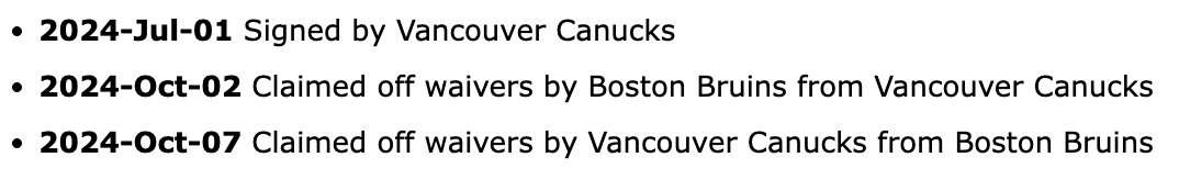 The other reason is that upon going down to the AHL, Patera suffered an injury that held him to just seven AHL games this season. But before all of that, the Canucks lost Patera on waivers while trying to assign him to Abbotsford. The good news for them was that the Boston Bruins later placed Patera on waivers themselves, meaning the Canucks were the only team eligible to reclaim him and assign him right to the minors. And that’s what they did, as they reclaimed Patera less than a week after losing him.