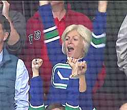 Mia Lack loves her son more than her son loves Chris Tanev. Here she is celebrating his shootout win over the LA Kings: