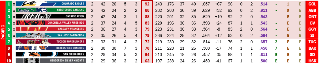 If first place is out of range, it behooves the Canucks to finish second, as the seventh and final placed team will either be the Tucson Roadrunners (72 points) or Bakersfield Condors (70 points), both of whom would come in as the lower seeded team within the Pacific Division.
