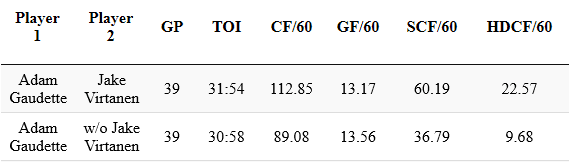 Adam Gaudette has seen a handful of different linemates this season. Early on, he saw time with players like Tanner Pearson and Josh Leivo, while now he finds himself with Antoine Roussel and one of either Jake Virtanen or Brock Boeser. His most consistent linemates have been Roussel and Virtanen. That trio has played 118 minutes of 5-on-5 together this season. During that ice time they have been able to control a positive goal share, something that the bottom six lines were unable to do last season