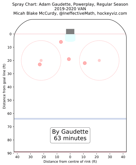 Another thing I like about Gaudette’s powerplay production is that he is not predictable on where he score his goals from. Here is powerplay his goal chart from this season.