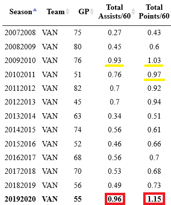 He is also generating scoring chances at a higher rate than ever in his career. While he has been on the ice this season, the Canucks have generated 28.3 scoring chances per 60 minutes, the highest total of his 13-year career.
