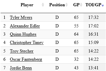 Though Edler has seen his power play minutes disappear this season he is still playing a ton of minutes at 5-on-5. Alex Edler currently sits second on the team in 5-on-5 minutes per game. He is trailing only Tyler Myers, who plays just over 17 and half minutes.