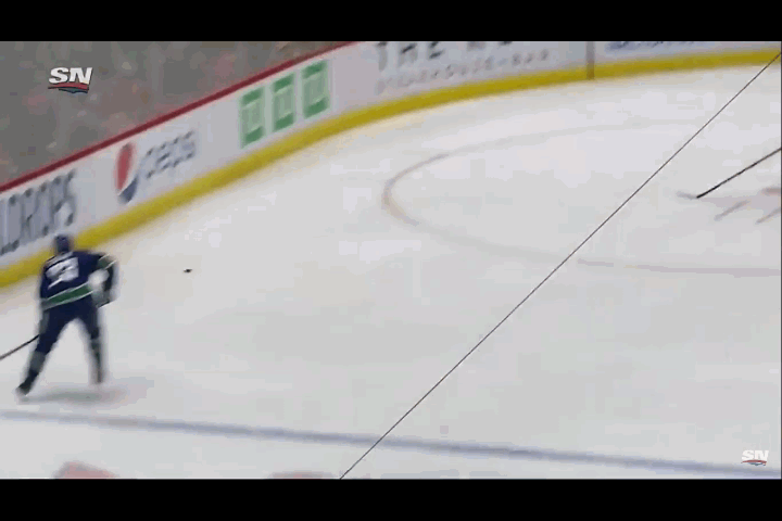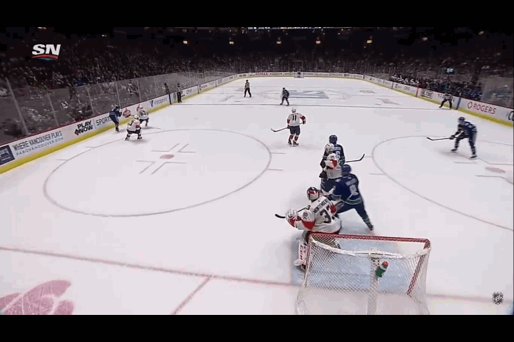Edler is also targeting stick blades from the point a lot. We see Bo Horvat angle in a lot of these type of plays. It’s almost like the slap pass but it is the quickest way to get the puck on net while simultaneously changing the angle on the goaltender.